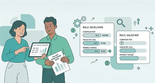 Salary benchmarking is the process of comparing the pay for a role against similar roles in the market. It uses real data from salary surveys, job boards, and compensation databases to give you a clear picture of where your pay sits relative to the market.